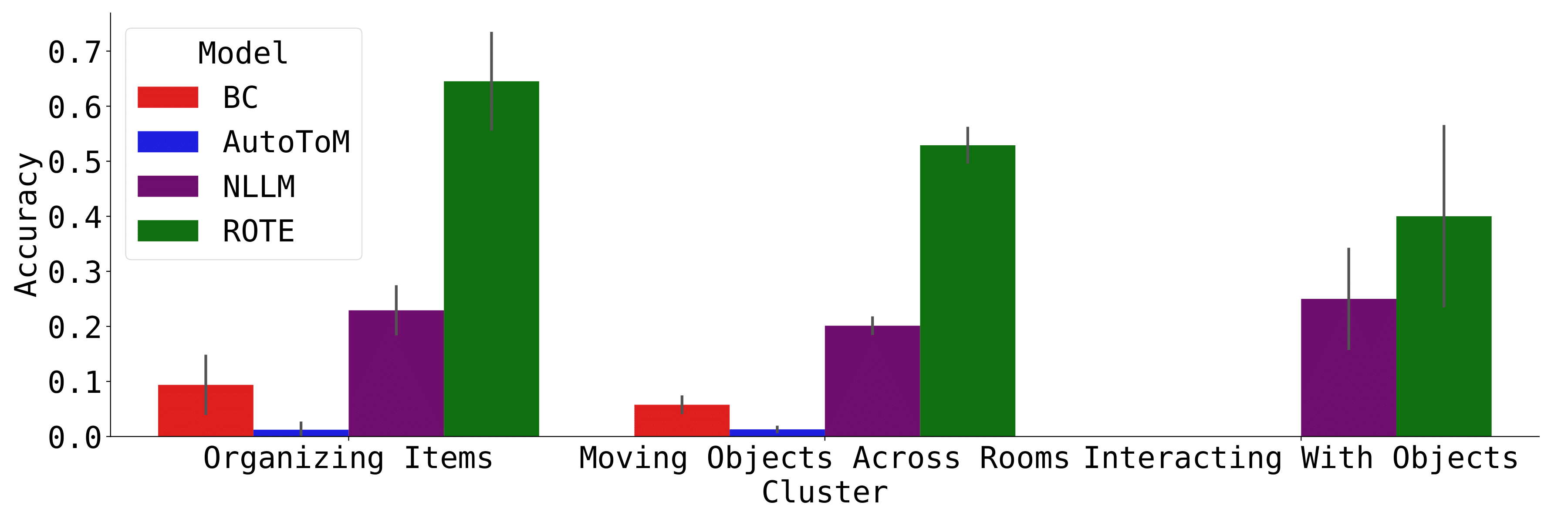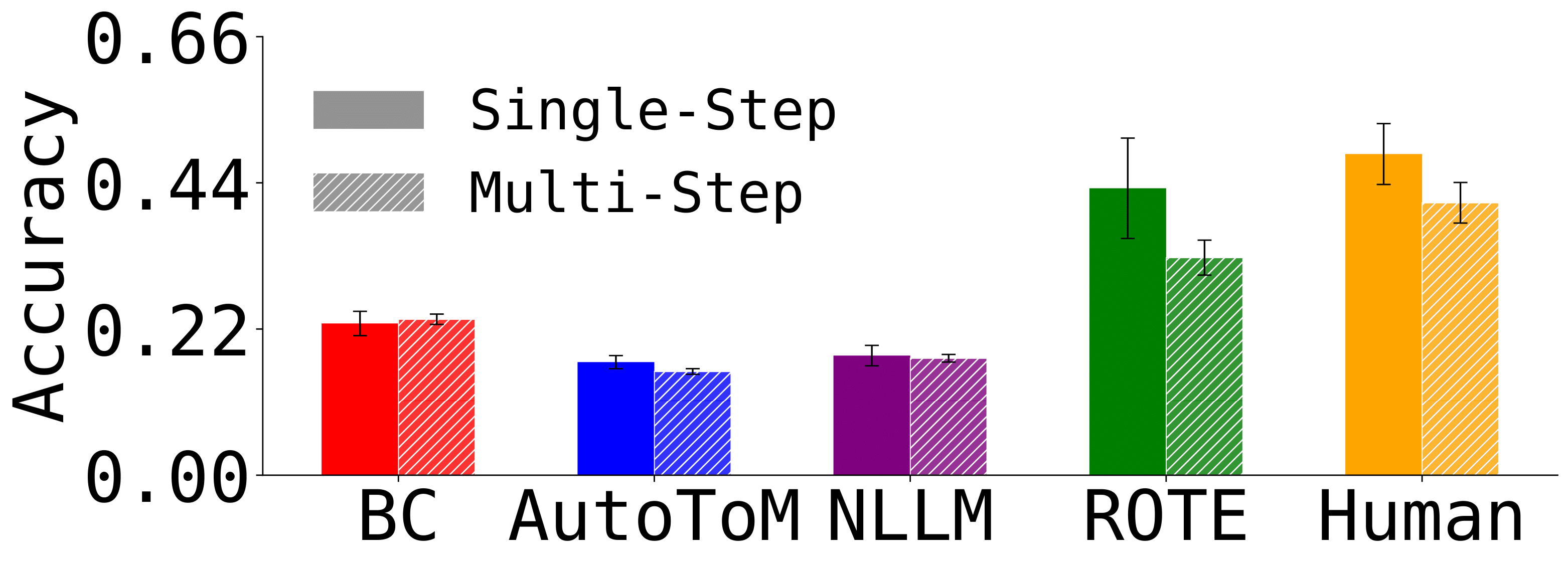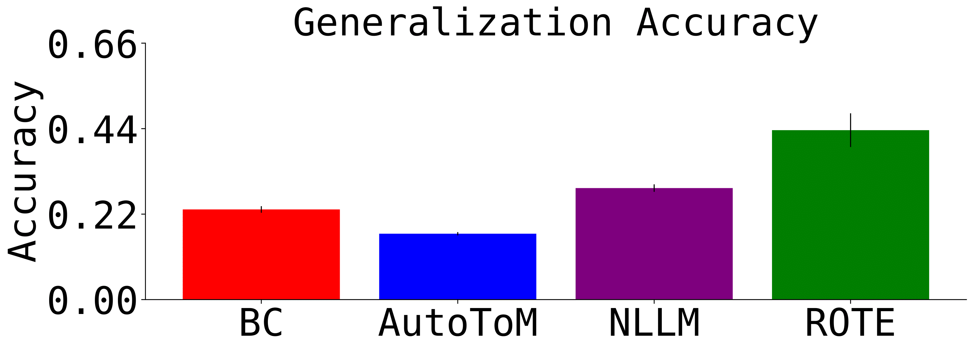 We compared ROTE against three competitive baselines: Behavior Cloning (BC), Automated Theory of Mind (AutoToM), and Naive LLM (NLLM) prompting.