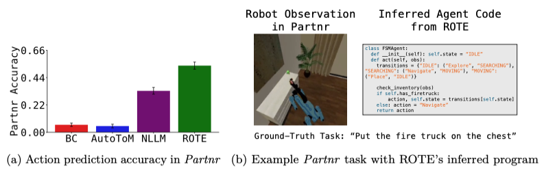 (a) Prediction accuracy in the large-scale, partially observable Partnr environment. ROTE demonstrated a superior ability to anticipate the behavior of goal-directed, LLM-based agents, with a two-sided t-test showing ROTE significantly outperformed all other models. (b) The pseudocode example illustrates how ROTE's inferred programs capture complex task logic using conditionals and state-tracking.