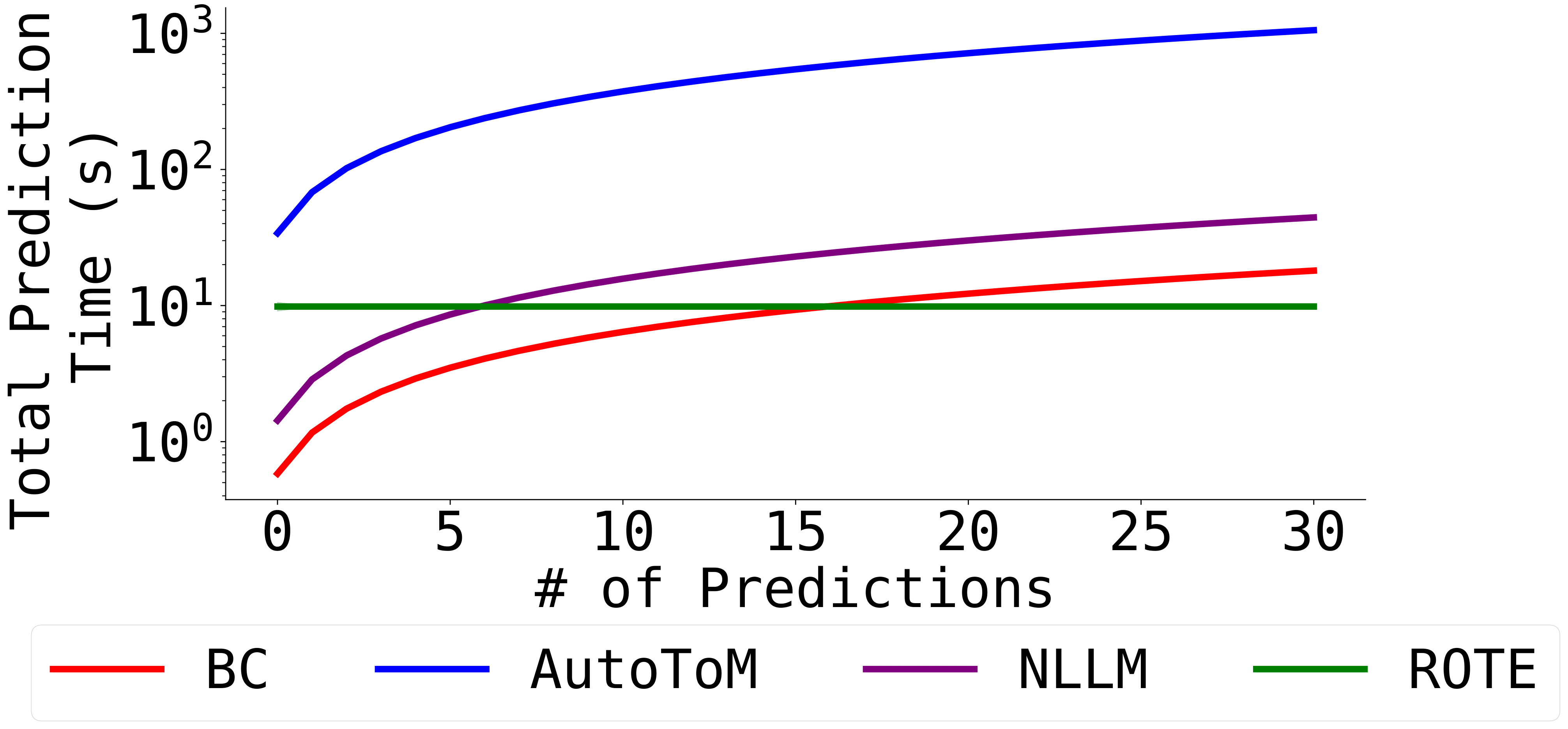 Total multi-step prediction time in Construction. Despite being slower than BC and Naive LLM prompting in the single-step prediction case, ROTE's programmatic representations enable its multi-step compute cost to scale orders of magnitude more efficiently than other approaches, making it better suited for long-horizon settings than other approaches for predicting individual behavior.