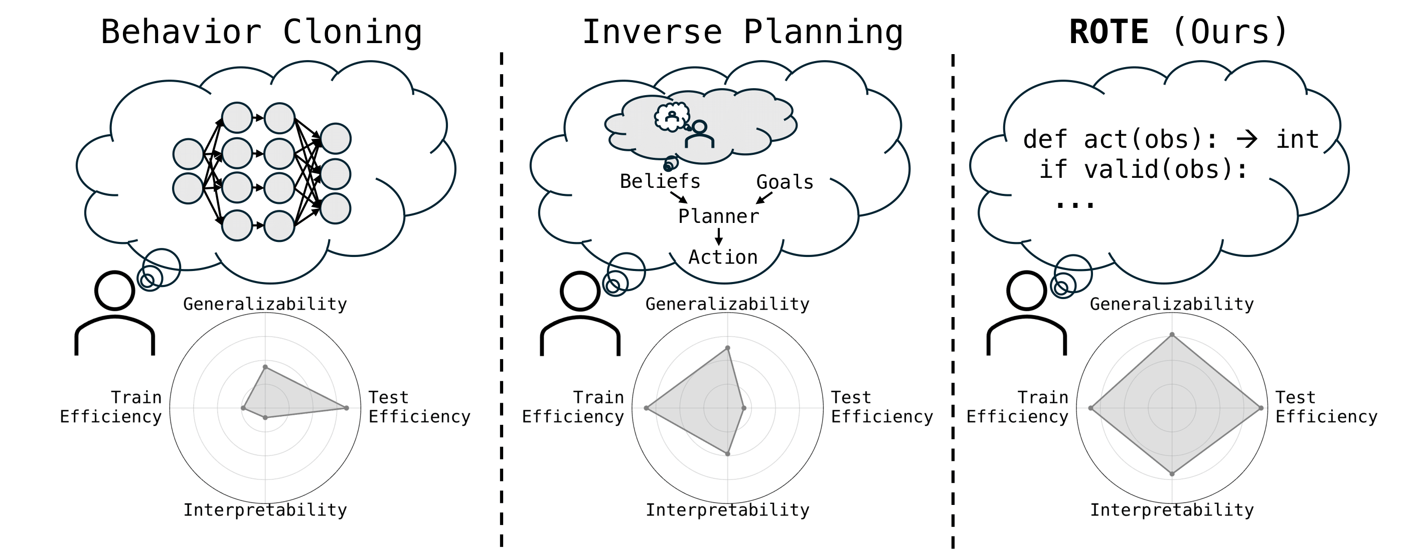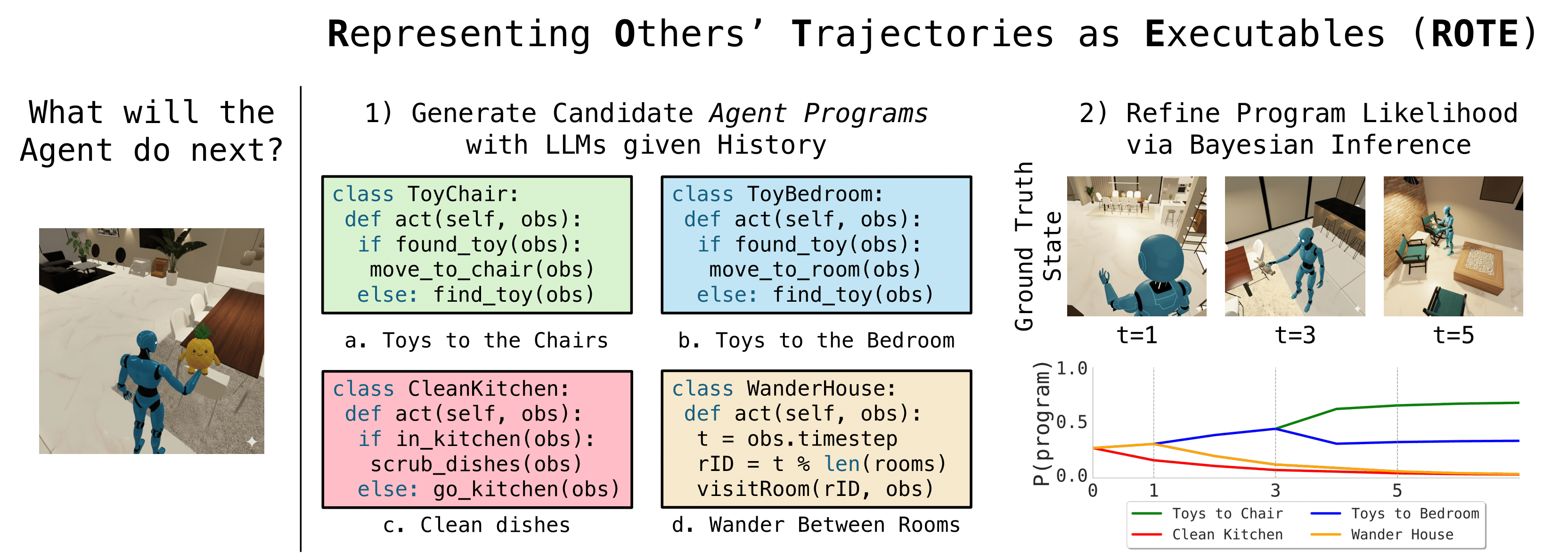 Humans can effortlessly predict the actions of others, a core skill for social coordination. While existing AI approaches try to achieve this using data-intensive neural networks or computationally paralyzed goal-inference methods, could modeling others as code offer a more accurate, efficient, and interpretable representation? We propose Representing Others’ Trajectories as Executables (ROTE), an algorithm that models behavior as executable scripts.
